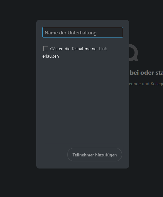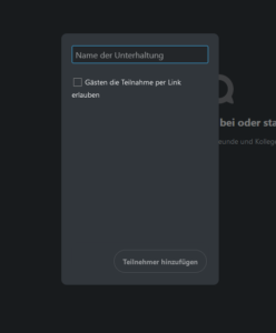 Zunächst geben Sie der Unterhaltung einen Namen. Danach haben Sie die Option die Unterhaltung für Gäste freizugeben (am Ende erhalten Sie einen persönlichen Link zum Weitergeben) und Sie können die Unterhaltung auch per Passwort zusätzlich absichern. Beides sind optionale Einstellungen; Sie können, aber müssen sie nicht auswählen.