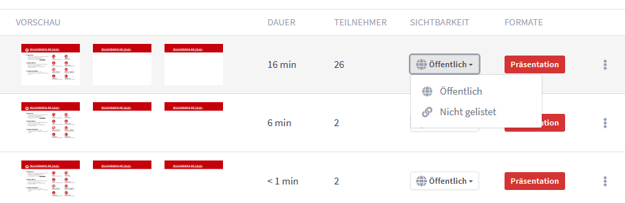Wollen Sie die Aufzeichnung danach mit Ihren Teilnehmern teilen, haben Sie zwei Freigabemöglichkeiten in der Aufzeichnungs-Übersicht: