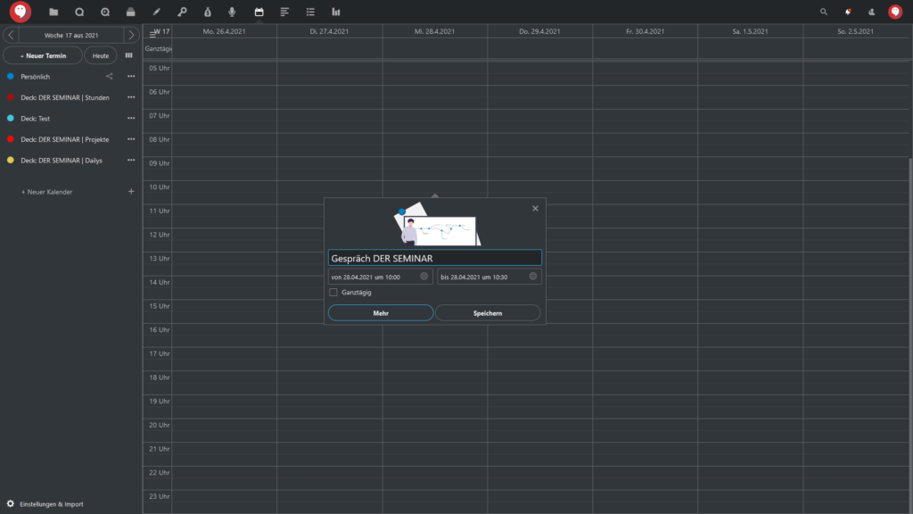 Nachdem Sie beim Erstellen eines Kalendereintrags auf “Mehr” geklickt haben, öffnet sich rechts ein neues Menü, wo Sie verschiedene Einstellungen vornehmen können, wie Datum und Uhrzeit einstellen.