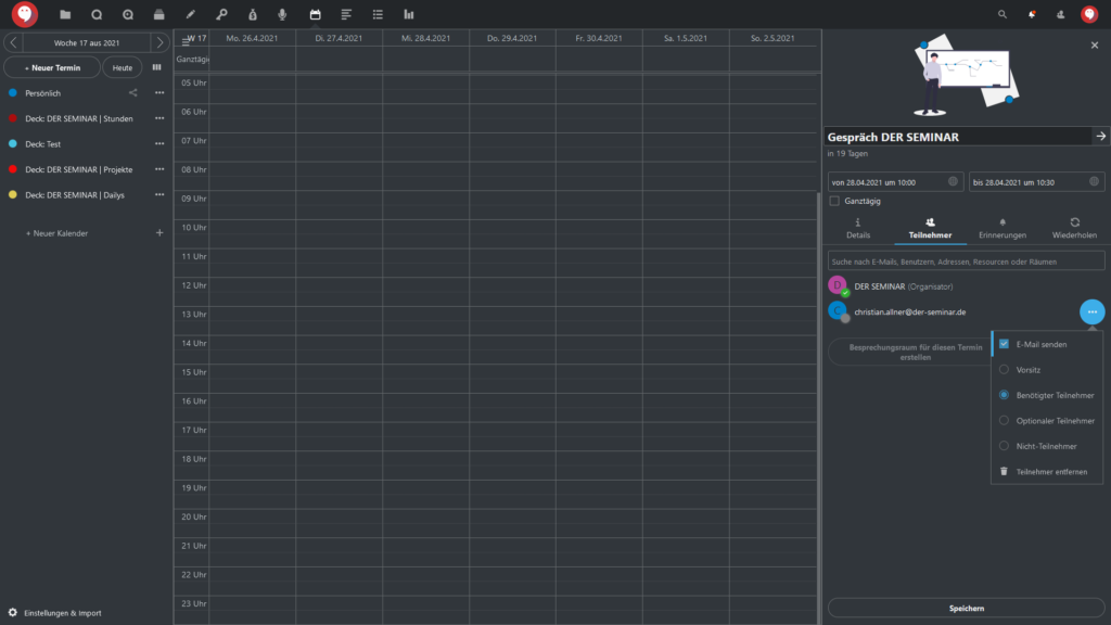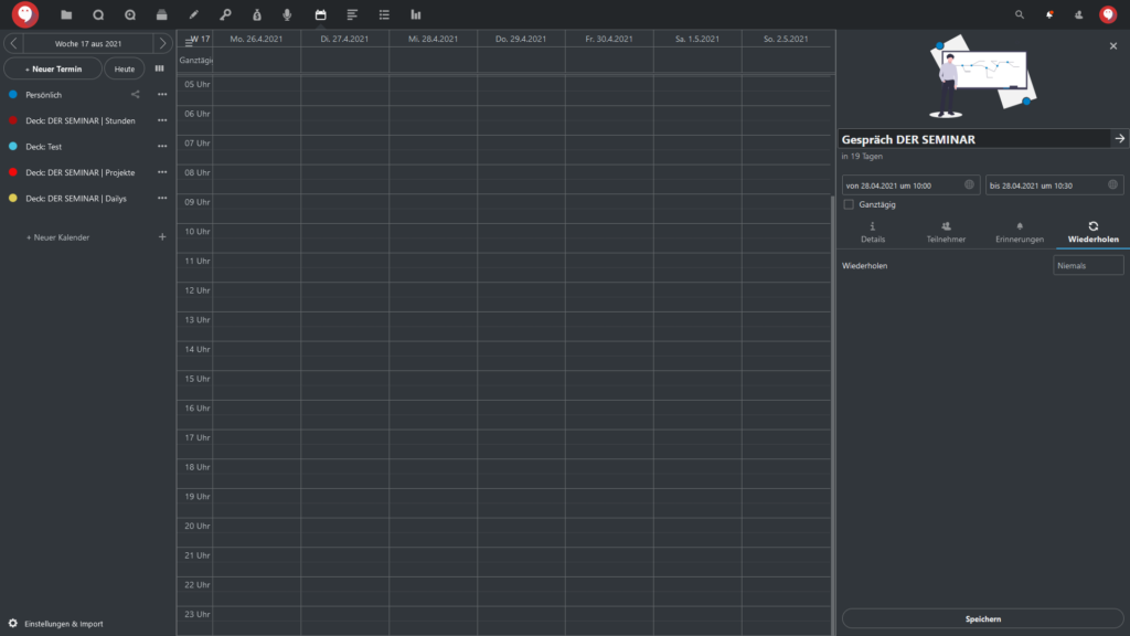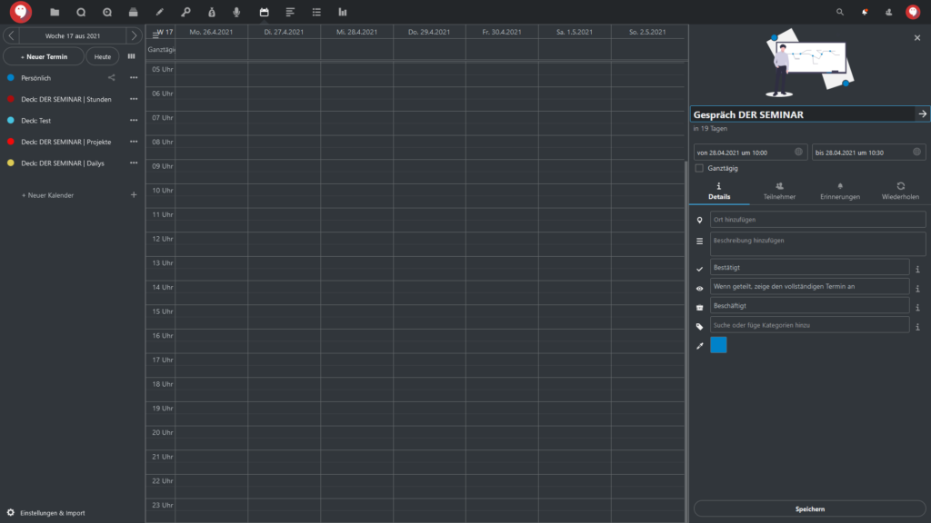 Standardmäßig klappt in den Einstellungen für den Kalendereintrag der Reiter “Details” auf, wo Sie: