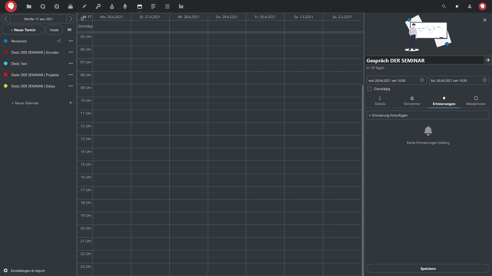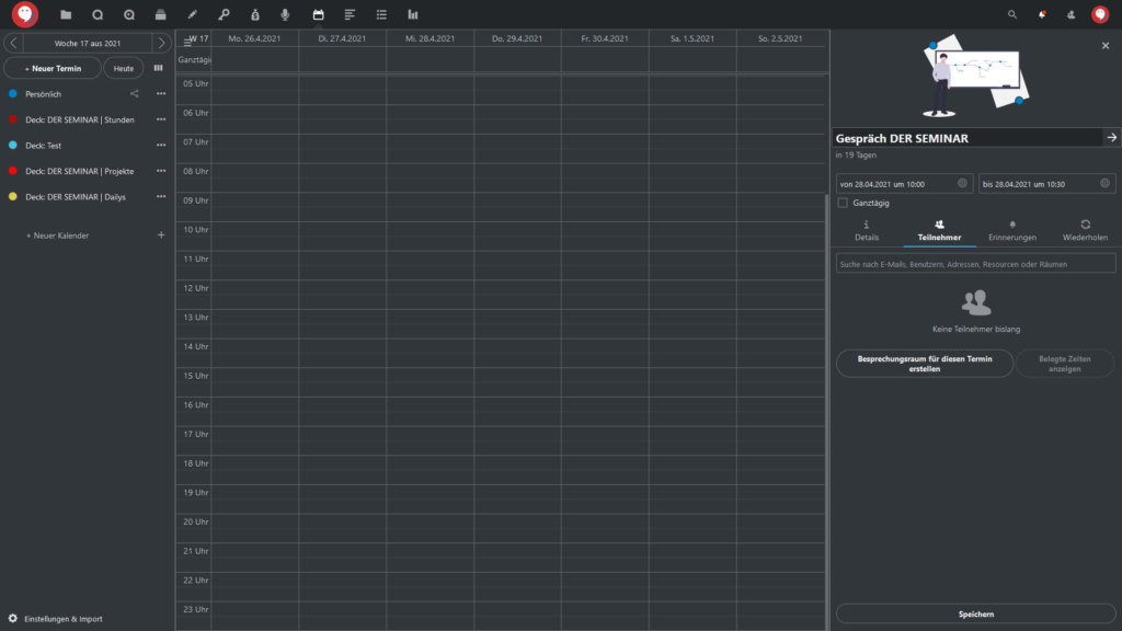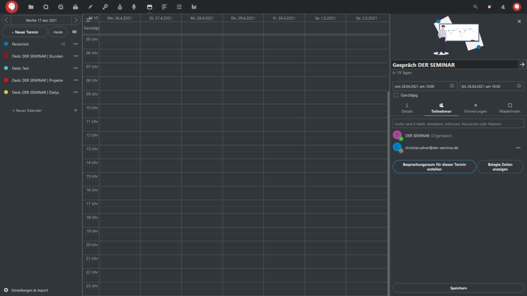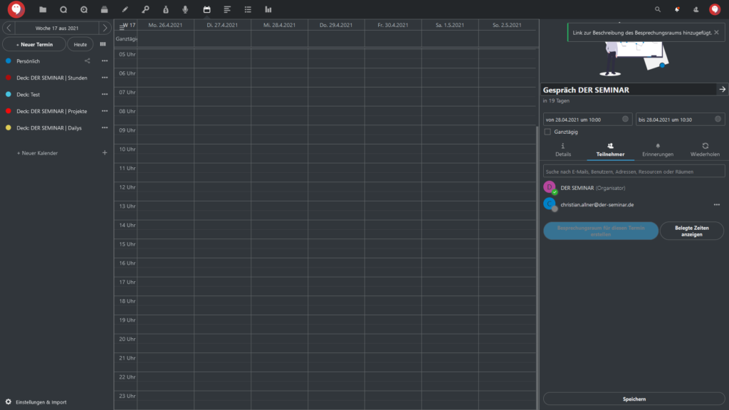 Im Reiter “Teilnehmer” können Sie auch einen “Besprechungsraum für diesen Termin erstellen”. Sie müssen nur den gleichnamigen Button klicken und in Talk wird automatisch eine Gruppenunterhaltung erstellt mit dem Namen des Termins (in unserem Beispiel also “Gespräch DER SEMINAR”.