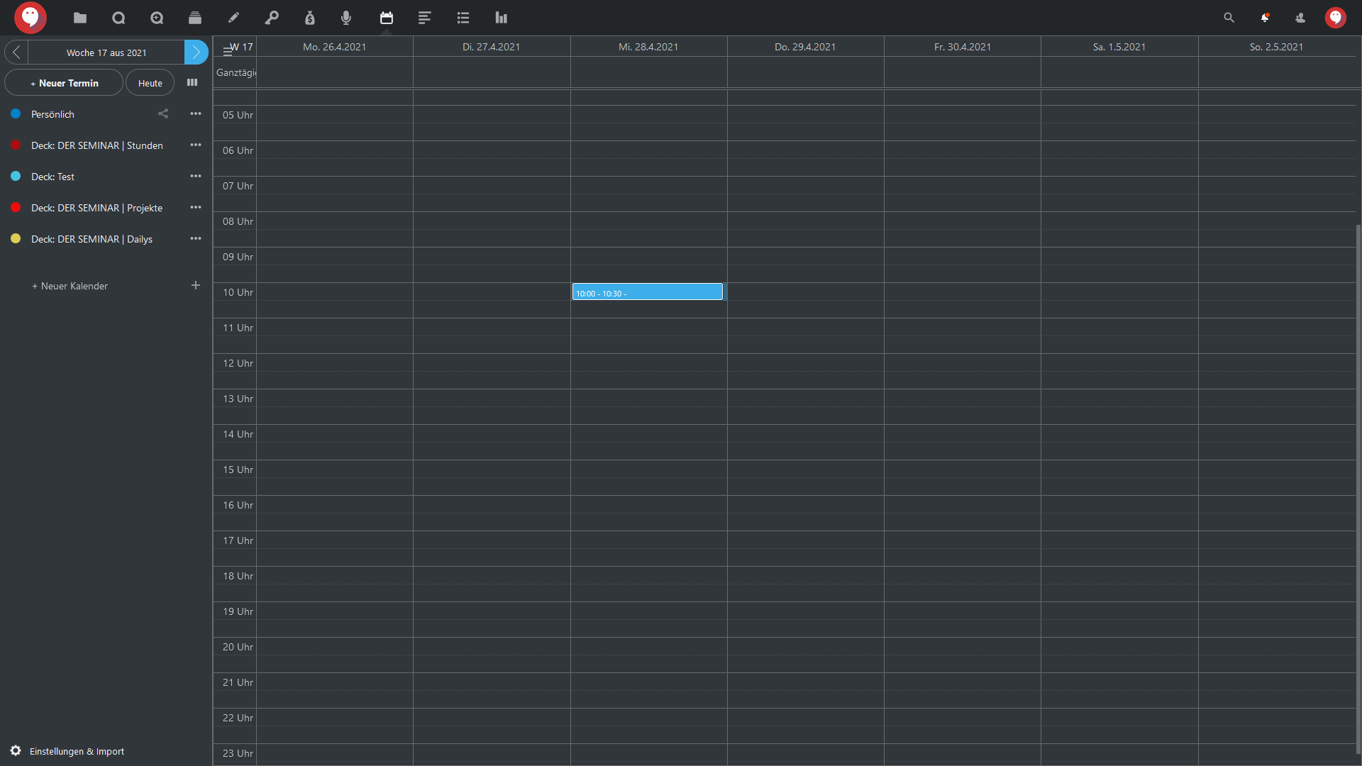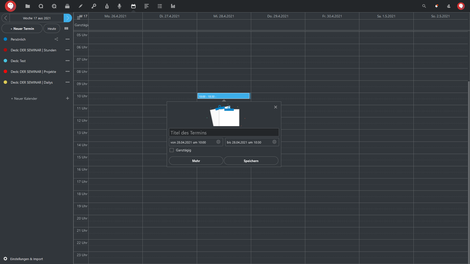 Klicken Sie entweder in der linken Menüleiste auf “+ Neuer Termin” oder auf die gewünschte Tages und Uhrzeit in der Kalenderansicht selbst: